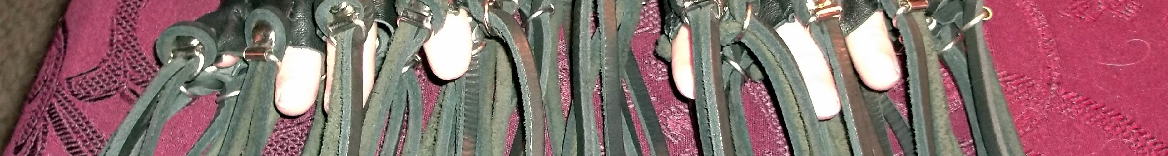These are special made glove floggers. I purchased them at Thunder in the mountains in Denver, CO. I have issues with the vision in one of my eyes and it causes depth perception problems, so having the falls right off the tips of my fingers is very helpful when it comes to striking the correct places. Each finger has 6 square falls attached at the tips, and give a thuddy rather than stingy feel. They were nearly 3 ft long but I had them shortened to better suit my short stature.