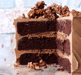 Devil’s Food Cake with Hazelnut Crunch INGREDIENTS Cake Nonstick vegetable oil spray 2 1/3 cups cake flour 1 cup natural unsweetened cocoa powder 1 1/2 teaspoons baking soda 1 teaspoon kosher salt 1/4 teaspoon baking powder 2 teaspoons instant espresso powder 1 cup hot coffee 1 cup buttermilk 2 1/2 cups sugar 1 cup (2 sticks) unsalted butter, room temperature 4 large eggs 1 large egg yolk 1 1/2 teaspoons vanilla extract 4 ounces semisweet or bittersweet chocolate (do not exceed 70%), melted, cooled slightly HAZELNUT CRUNCH 1/4 cup hazelnuts 2 ounces semisweet or bittersweet chocolate (do not exceed 70%), chopped 2 tablespoons (1/4 stick) unsalted butter 1/2 cup Nutella 3 cups toasted rice cereal FROSTING AND ASSEMBLY 8 ounces high-quality milk chocolate (such as Lindt or Scharffen Berger), chopped 8 ounces semisweet or bittersweet chocolate (do not exceed 61%), chopped 1 1/2 tablespoons light corn syrup 1 1/2 cups heavy cream 1 cup (2 sticks) chilled unsalted butter, cut into 1/2-inch pieces CAKE Preheat oven to 350°. Coat the bottom and sides of cake pans with nonstick spray. Line bottom of pans with parchment-paper rounds; spray paper. Sift cake flour, cocoa powder, […]