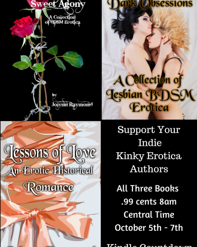 As a thank your for your support, you can read Jolynn’s Dark Erotic Kindle books in the Kindle Countdown Sale that starts at 8am CST October 5th – 7th . All books will start out at .99 cents , and Lessons of Love is not normally on sale, and there will be spanking. {FYI}